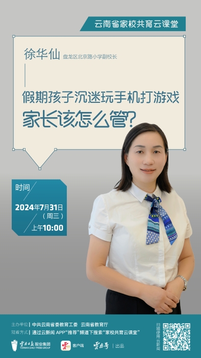 暑期放假,不少家长正在为孩子沉迷玩手机、打游戏的问题而苦恼,7月31日上午10:00,云南家校共育云课堂第七期——《假期孩子沉迷玩手机打游戏,家长该怎么管?》在云新闻客户端上线,本期邀请昆明市盘龙区北京路小学副校长徐华仙老师,与大家聊聊假期孩子沉迷玩手机、打游戏,父母怎么办?一起来看看吧!