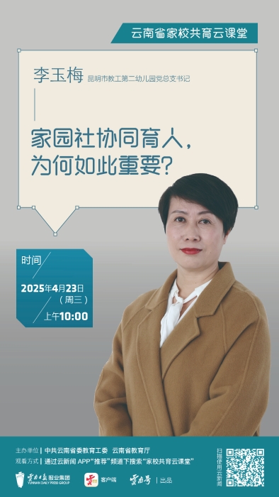 4月23日上午10:00,云南家校共育云课堂第十六期——《家园社协同育人,为何如此重要?》在云新闻客户端上线。本期节目邀请了昆明市教工第二幼儿园党总支书记李玉梅,她将结合丰富的学前教育经验,深入探讨家园社协同育人的必要性和实施路径。