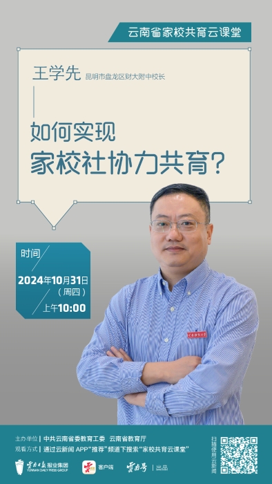 2024年10月31日上午10:00,云南家校共育云课堂第十期——《如何实现家校社协力共育?》在云新闻客户端上线,本期聚焦家、校、社协同育人的落实举措,邀请了昆明市盘龙区财大附中校长王学先谈谈,凝聚家校社教育最大合力,培养德智体美劳全面发展的社会主义建设者和接班人。