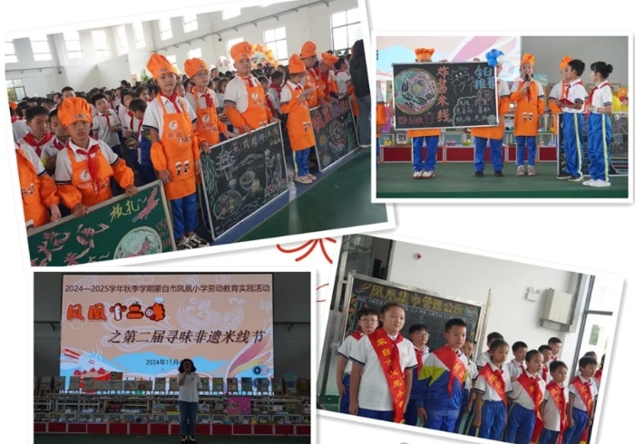 为更好地拓展现代劳动教育内涵的新深度、新广度,凤凰小学开设校本课程“凤凰十二味”,结合劳动实践“小厨王大比拼”“凤凰米线集市”“寻味·非遗”米线节等活动的成功举办,让学生的劳动综合能力得到进一步发展提升。孩子们在劳动教育实践基地“知耕园”中种下的菜,成了“米线节”上重要的食材,大家化身“小厨师”把自己做的菜烹饪成了一道道特色美食,邀请学生和家长组成的“美食品鉴团”品尝并进行投票。